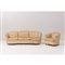 Salotto composto da un divano a tre posti ed una poltrona, struttura in legno con imbottitura e rivestimento in tessuto di raso champagne a motivi floreali, piedi conici in legno. Segni di usura.