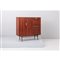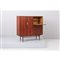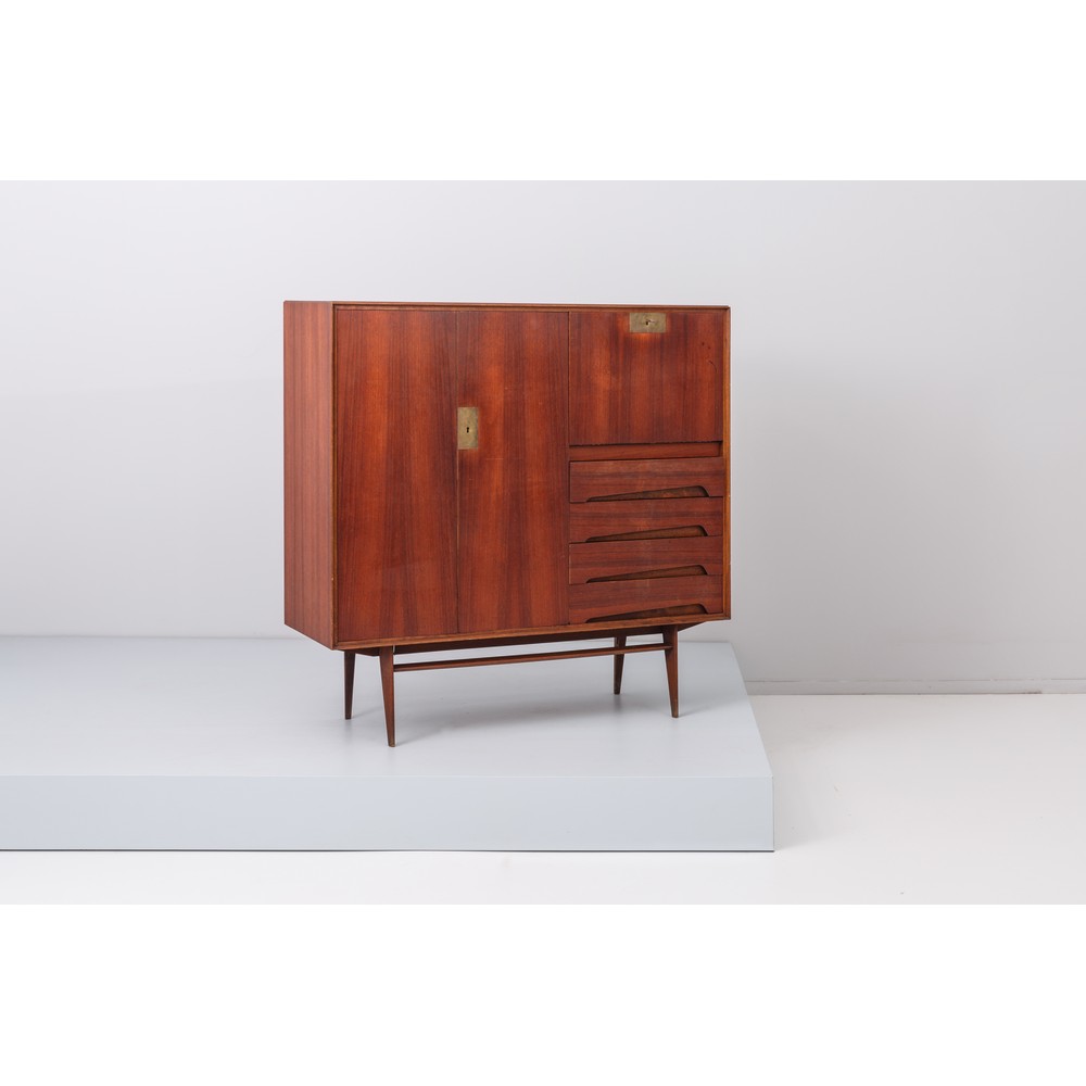 Mobile bar in legno di noce, corpo rettangolare, un vano con due ante a battente, un vano a ribalta e quattro cassetti, piedi a svasare.