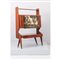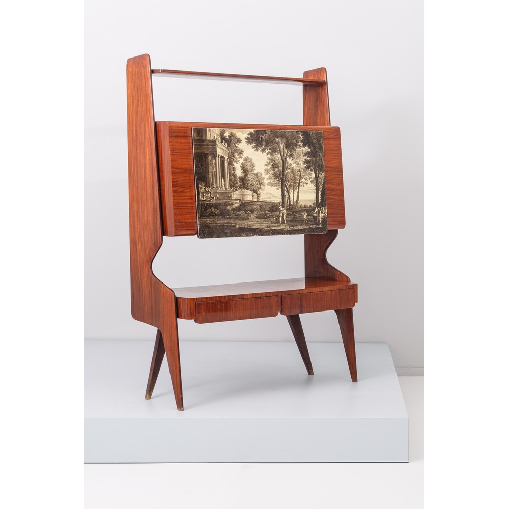 Mobile Bar in legno palissandro, anta frontale in pergamena decorata con scena classica, due cassetti e una mensola. Segni di usura.