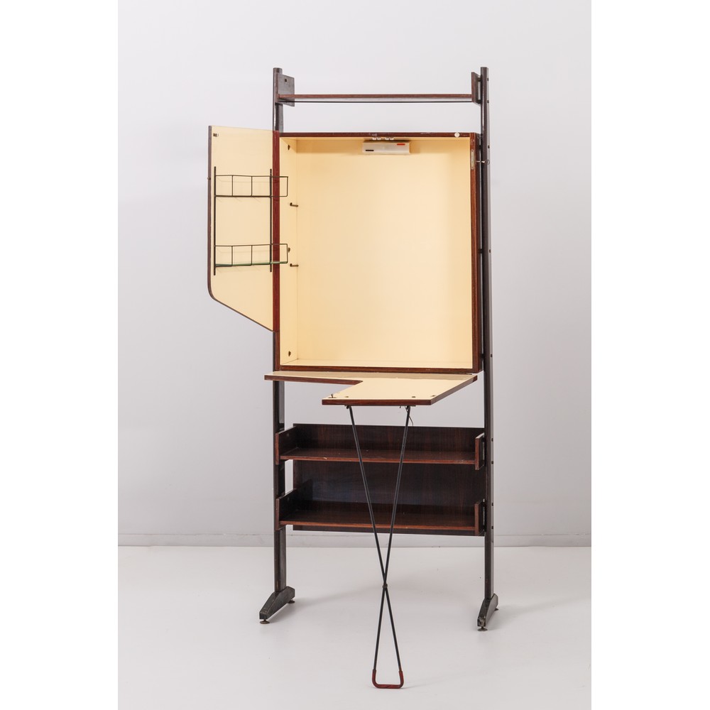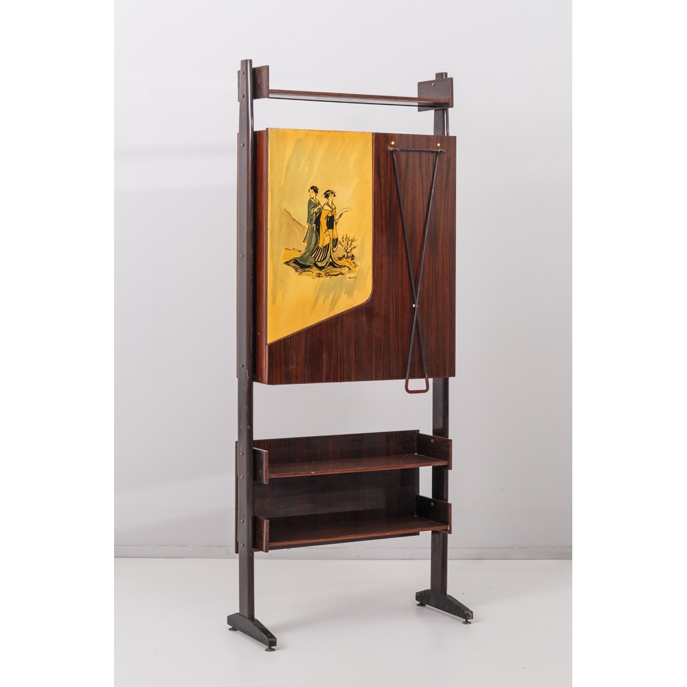 Mobile libreria in legno di palissandro, un vano bar sulla parte superiore chiuso con anta a ribalda decorata con figure orientabile.