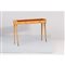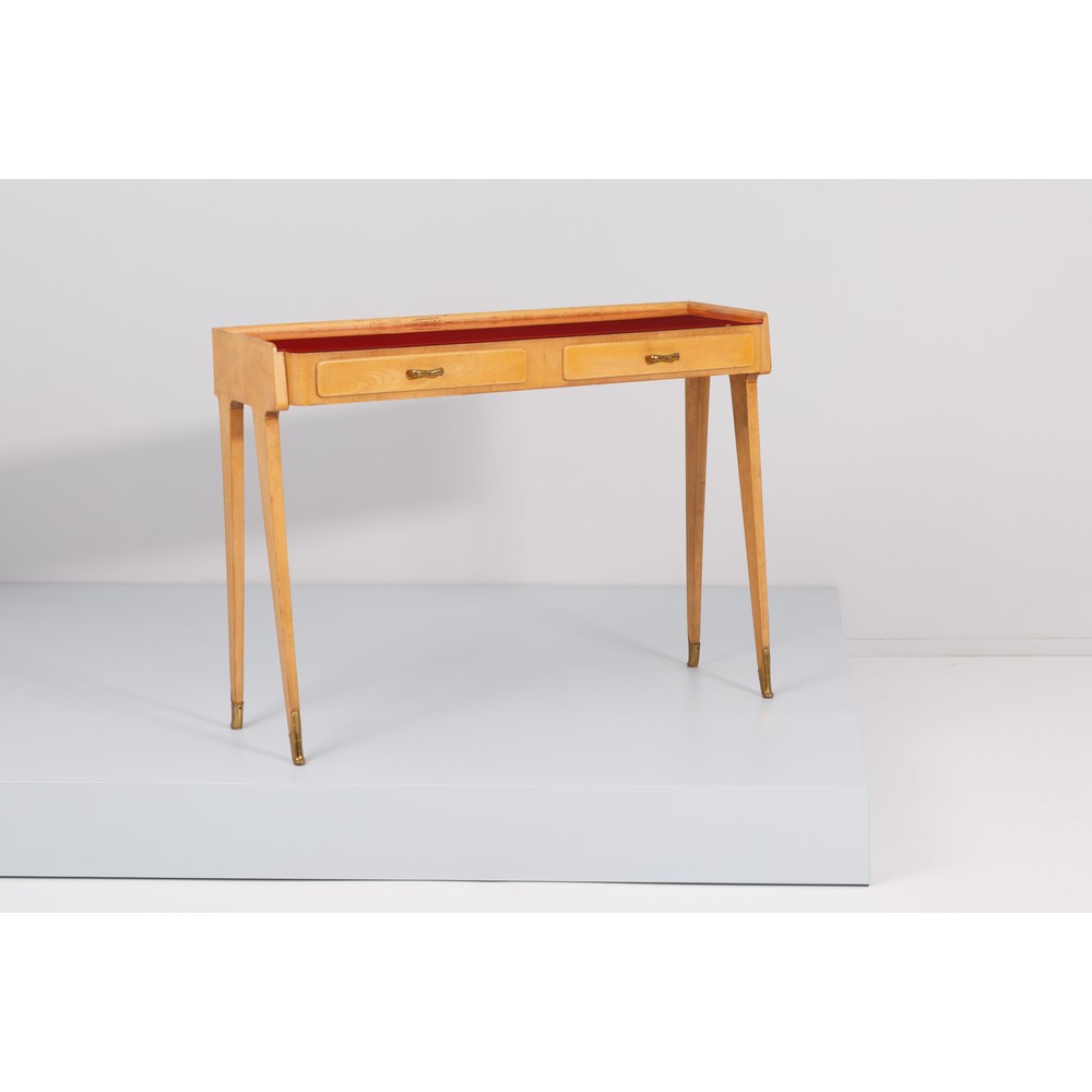 Consolle in legno di acero con due cassetti su fronte, gamba a svasare, scarpette in ottone, piano in vetro retro-laccato rosso.