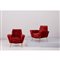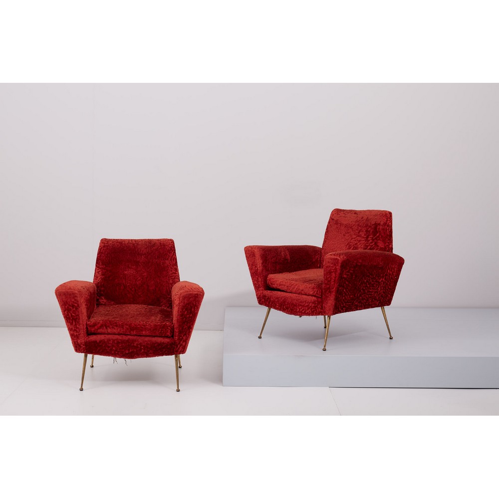 Coppia di poltrone ‘Orsetto’ struttura in legno con imbottitura e rivestimento in tessuto rosso rosso, piedi a spillo in ottone dorato.