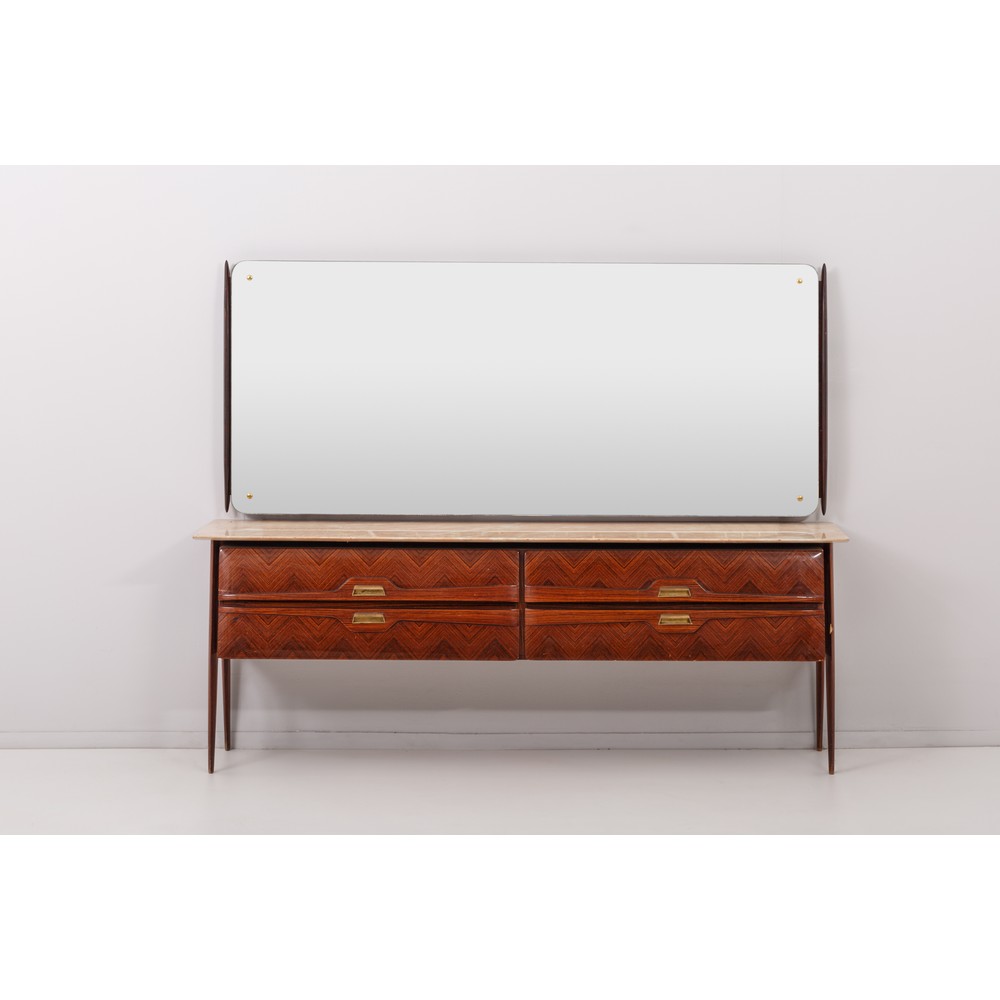 Mobile in legno di palissandro, corpo rettangolare, quattro cassetti, piano in marmo, grande specchio sul piano con supporti in legno. Finiture in ottone. Marchio di produzione Cecchini & C, Cantù.