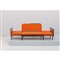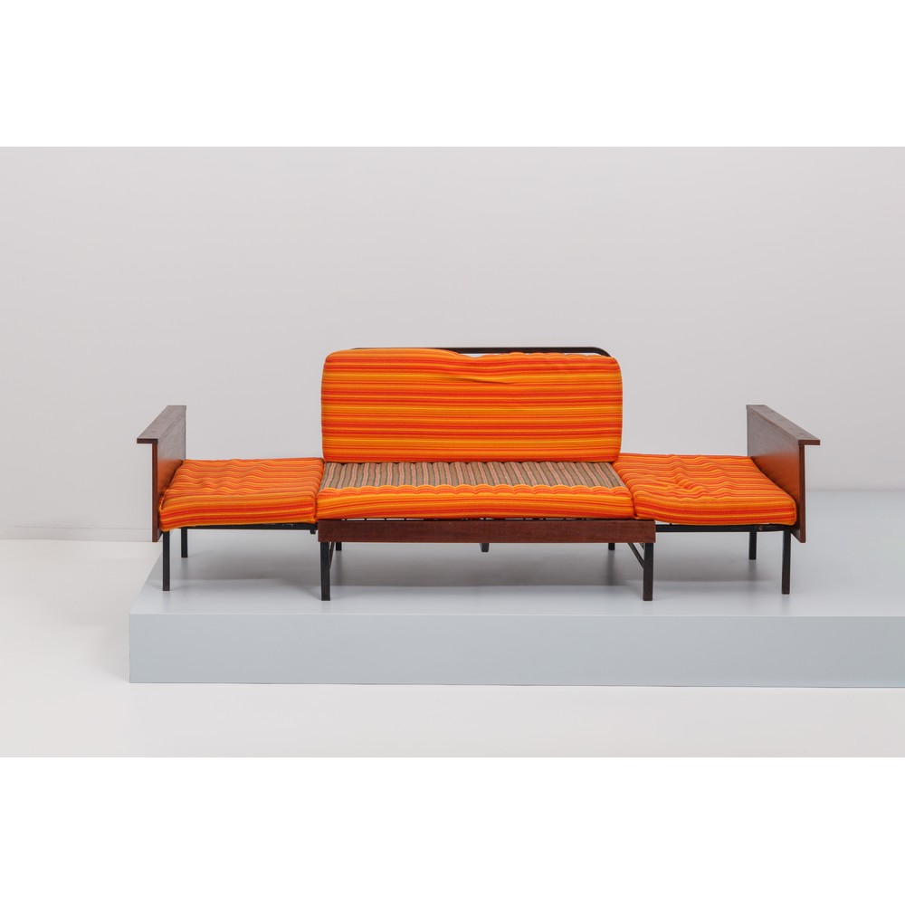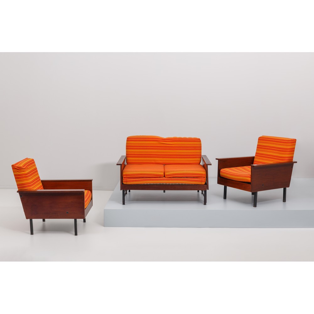 Salotto composto da divano a due posti (allungabile da entrambi i lati diventando letto singolo) e coppia di poltrone, fianchi in legno, seduta e spalliera imbottita e rivestita in tessuto a righe arancione e giallo, piedi in quadralino laccato e puntale in legno nero.