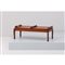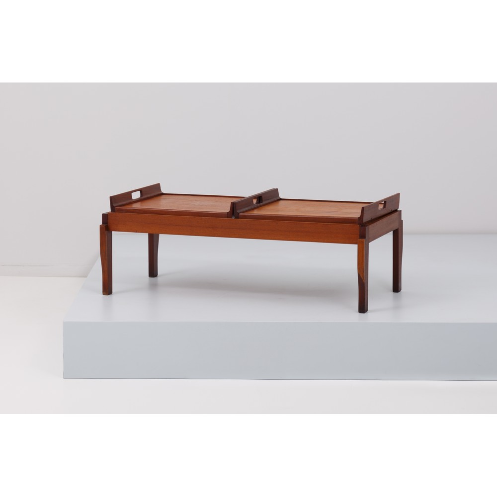 Un tavolo basso in legno, piano rettangolare con due vassoi amovibili. Piedi in legno sagomati.