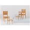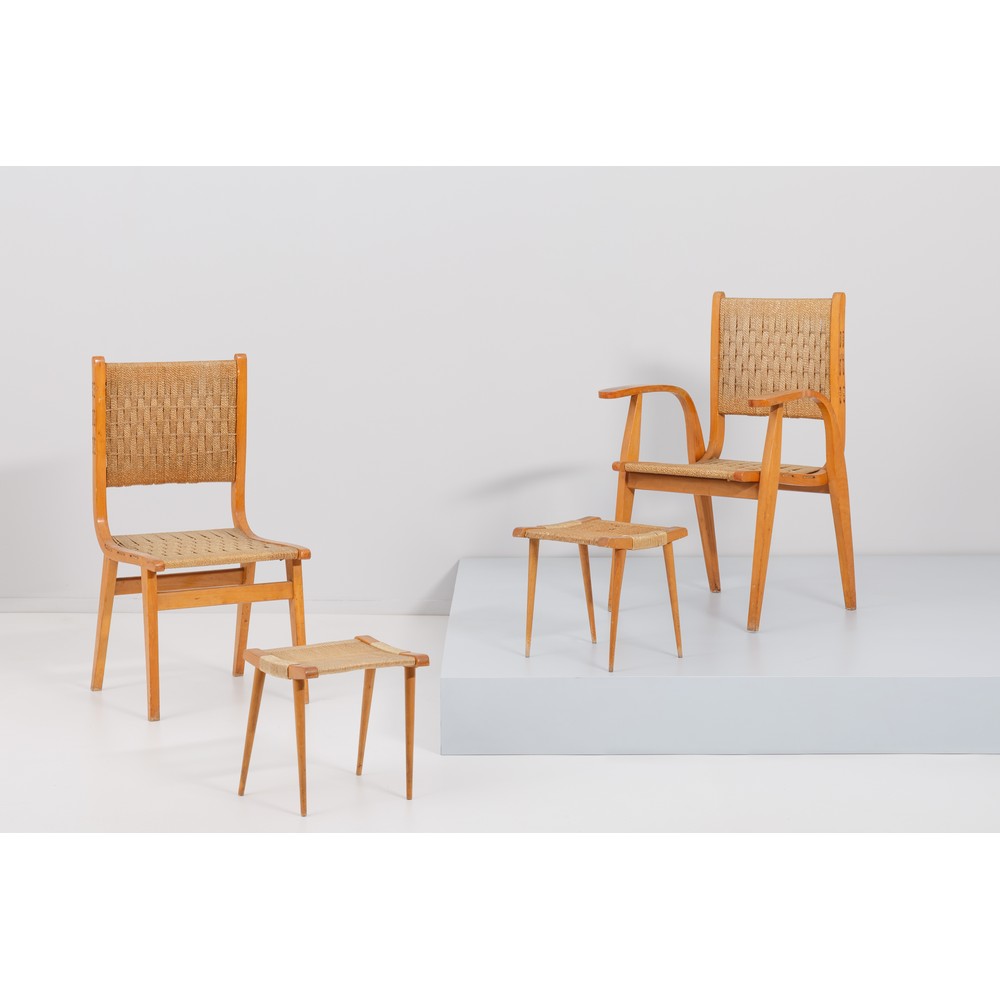 Una poltrona, una sedia e due poggia piedi in legno chiaro, seduta e spalliera in corda.