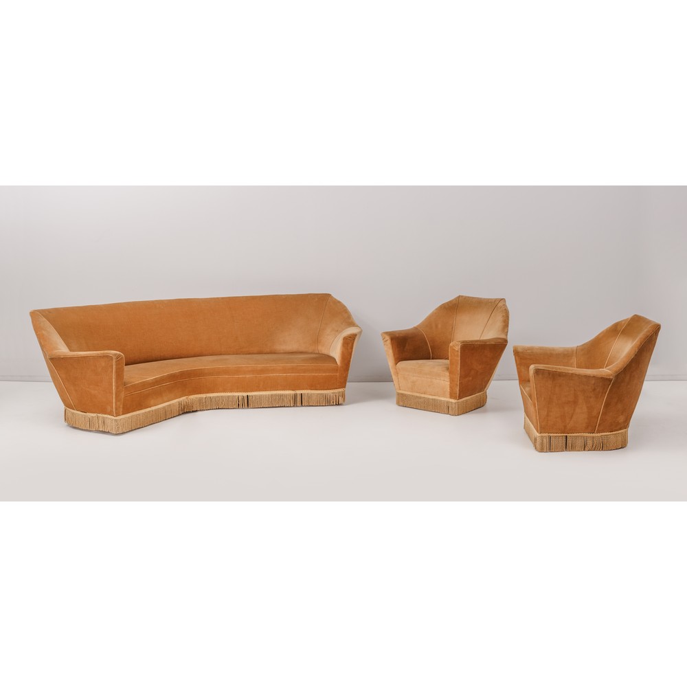 AN ITALIAN SOFA AND PAIR ARMCHAIRS.