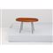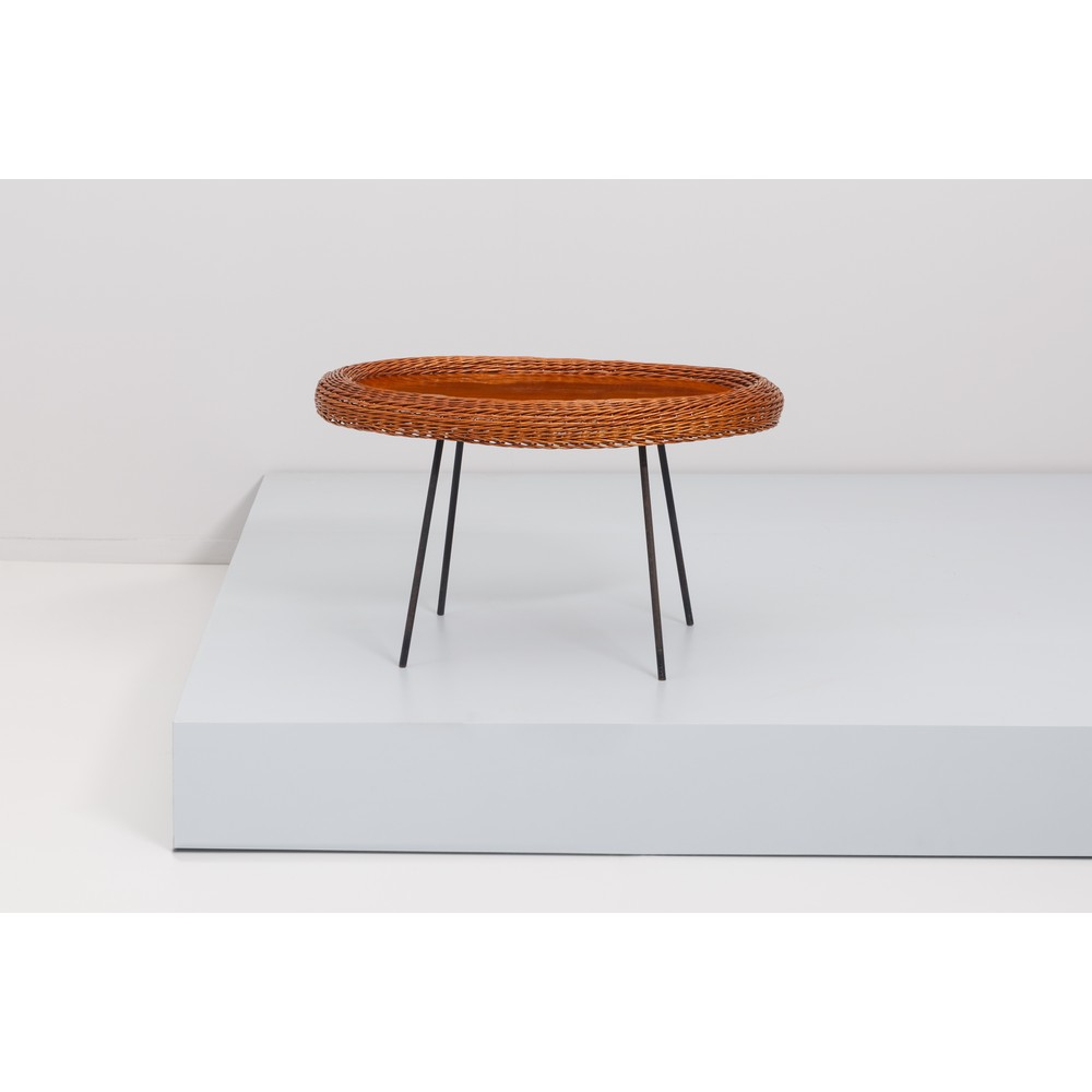 Tavolino basso, piano ovale in legno, cornice in rattan intrecciato, gambe in tondino di ferro verniciato nero.