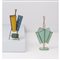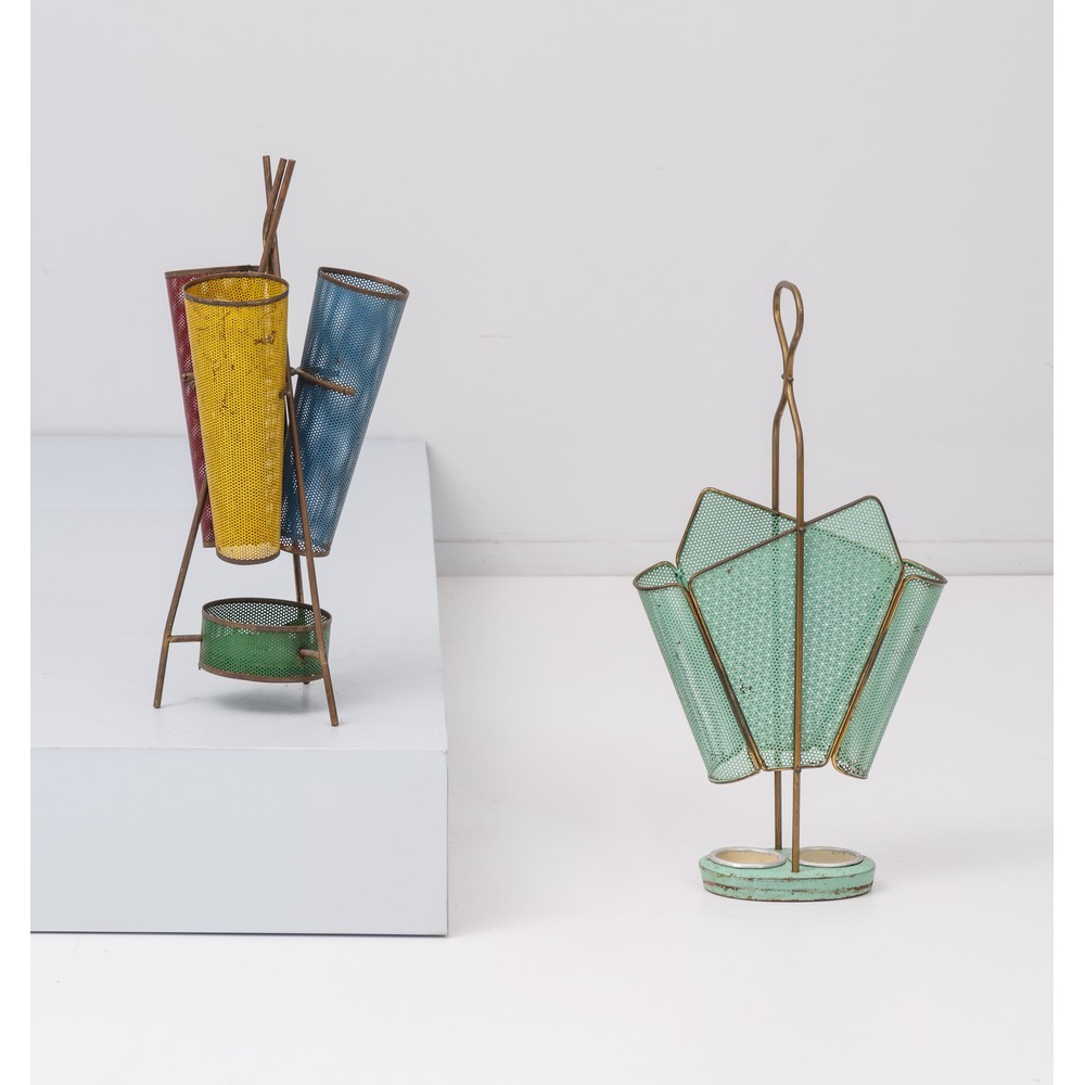Due portaombrelli in metallo microforato uno con tre cilindri nei toni giallo, rosso, blu e verde, l'altro con corpo conico verde, entrambi con finiture in tubolare di ottone.