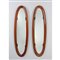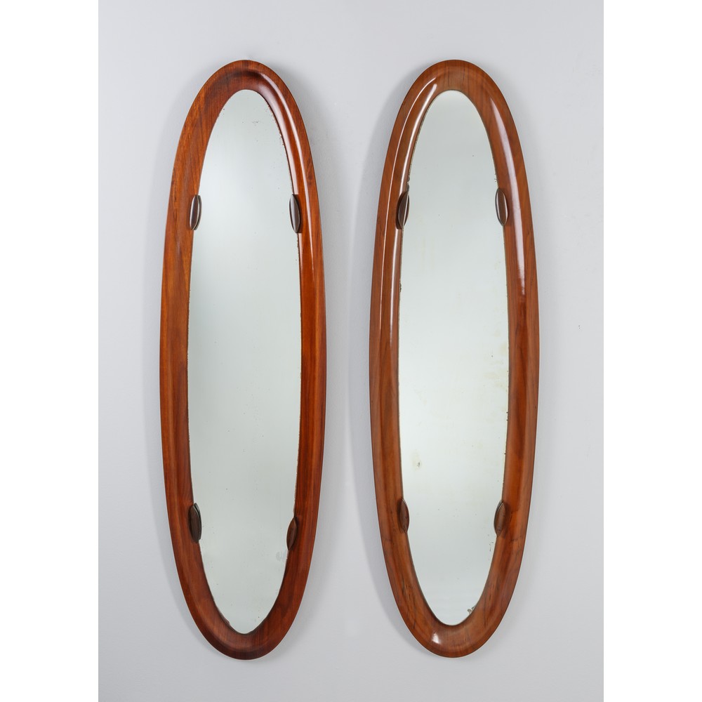Coppia di specchiere da parete, corpo ovale con cornice in compensato impiallacciato curvato, vetri specchiati, supporti in metallo.