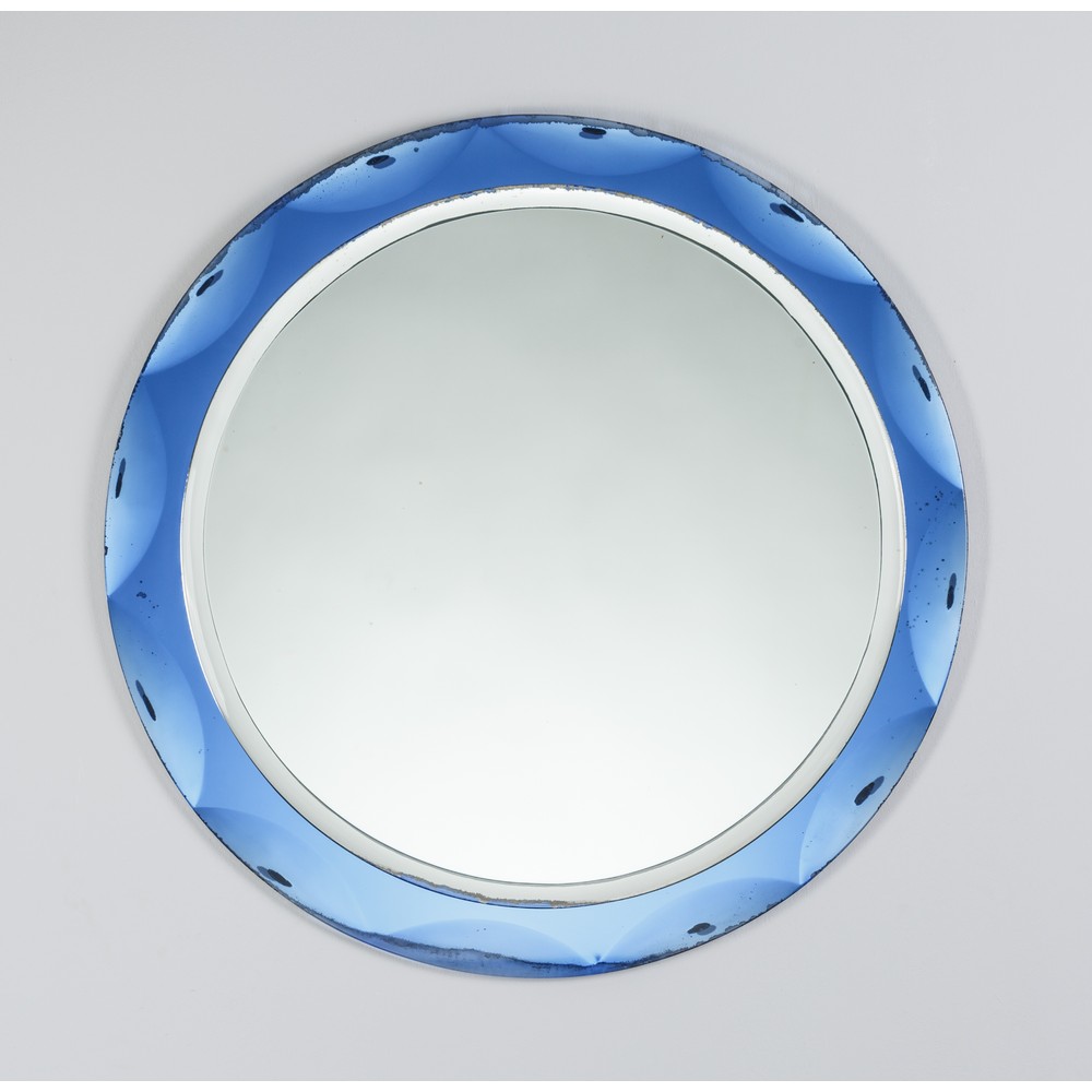 Specchio da parete, corpo circolare, cornice sfaccettata, in vetro blu. Difetti.