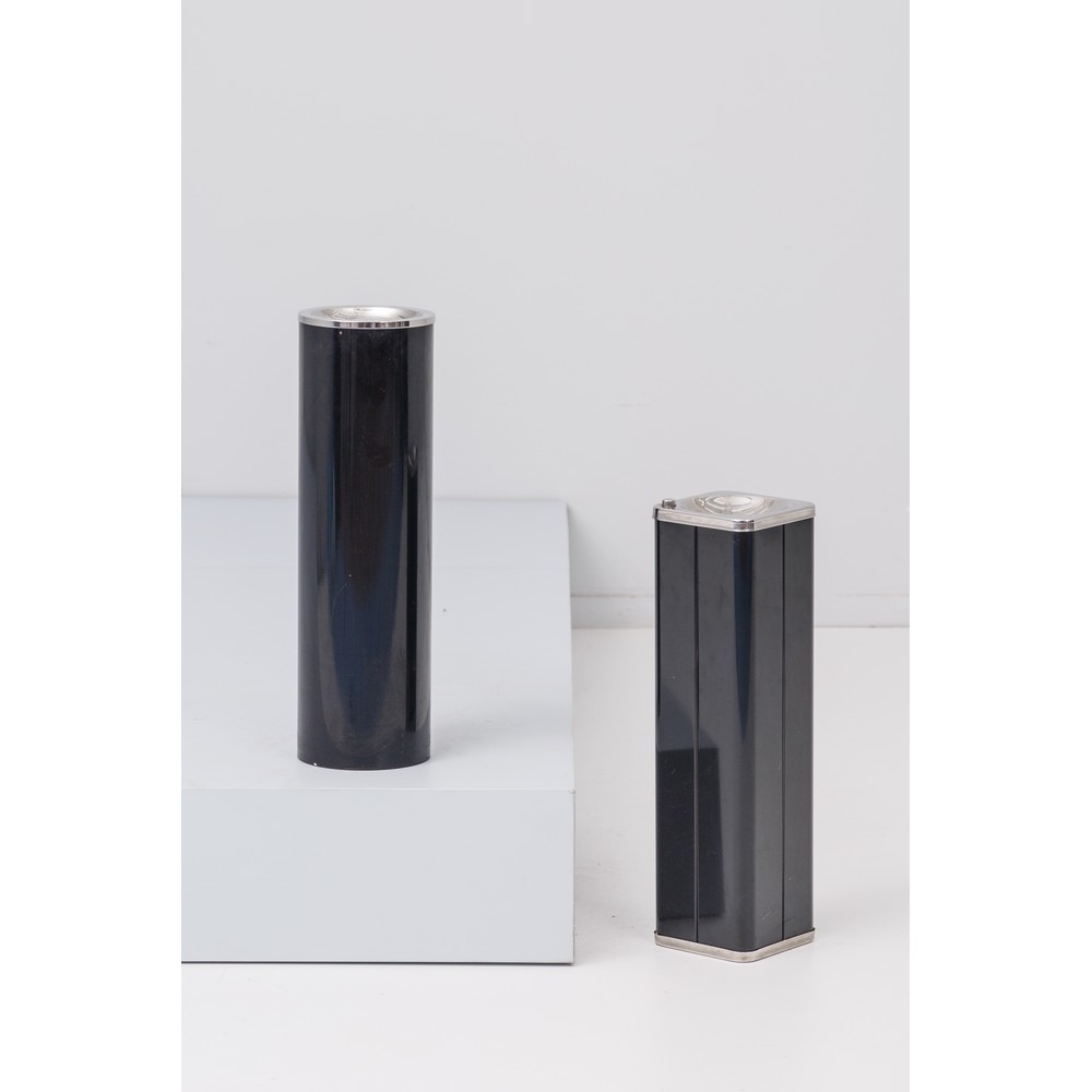 Due posaceneri da terra in metallo verniciato nero, uno con corpo cilindrico e l’altro con corpo a parallelepipedo, acciaio cromato.