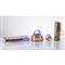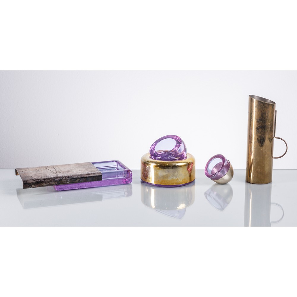 Quattro oggetti in metallo argentato e vetro colorato viola, uno svuotatasche rettangolare in vetro lavorato con coperchio scorrevole, incisione ‘AdC Silver Plated’, due posaceneri semisferici su supporto metallico (uno mod. ‘biglia’), e una piccola caraffa cilindrica in metallo dorato.