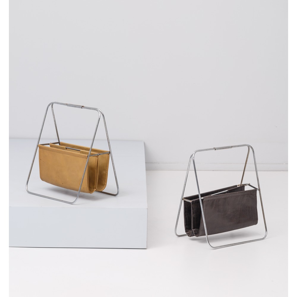 Due portariviste in tubolare di metallo cromato e pelle uno nei toni cocnac e uno nei toni nero. Mancanza di un tubolare.