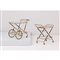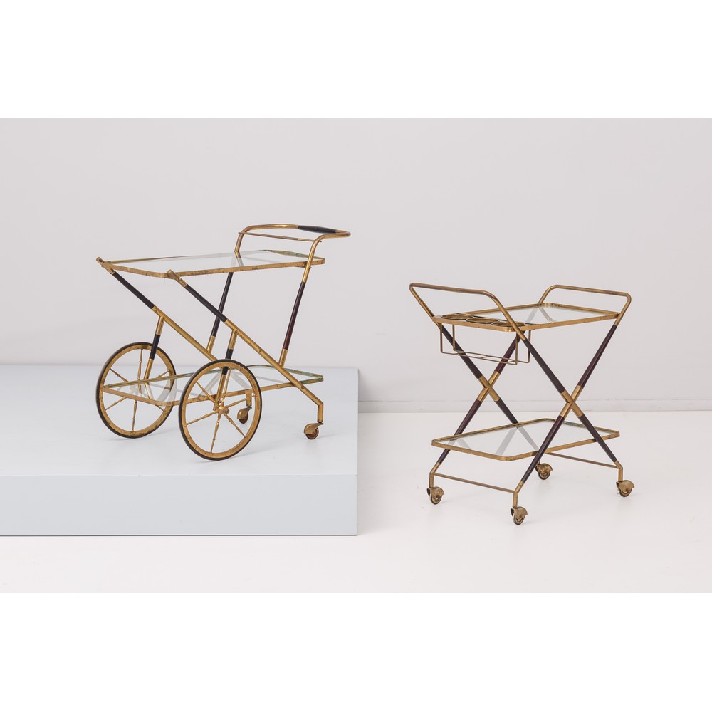 Due carrelli da servizio dalle linee geometriche in legno e ottone con due ripiani in vetro trasparente.