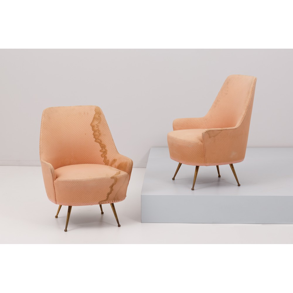 Coppia di poltrone struttura in legno con imbottitura e rivestimento in tessuto rosa, gambe a spillo in ottone. Segni di usura, macchie su tessuto.