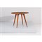 Tavolo rotondo in legno di teak, piano con bordo arrotondato, quattro piedi a spillo.