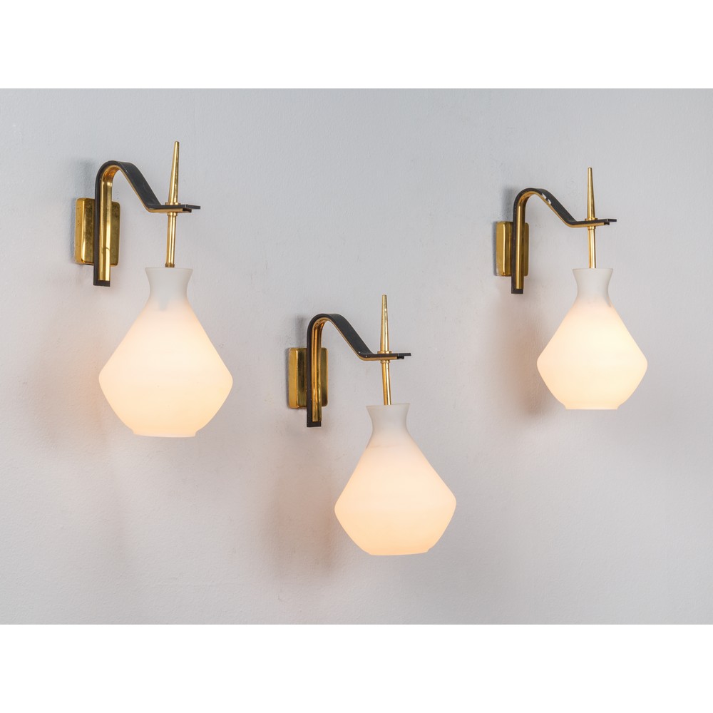 Tre lampade da parete ad una luce, struttura in ottone e metallo verniciato nero, diffusore a prisma in vetro satinato bianco.