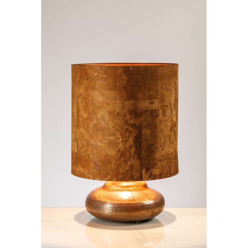 Lampada da tavolo a una luce, base in terracotta argentata a globo schiacciato, paralume in sughero.