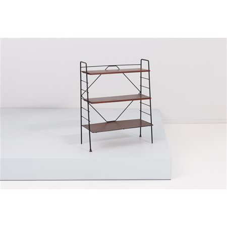 Cartiera in tondino di metallo verniciato nero, tre ripiani in legno.