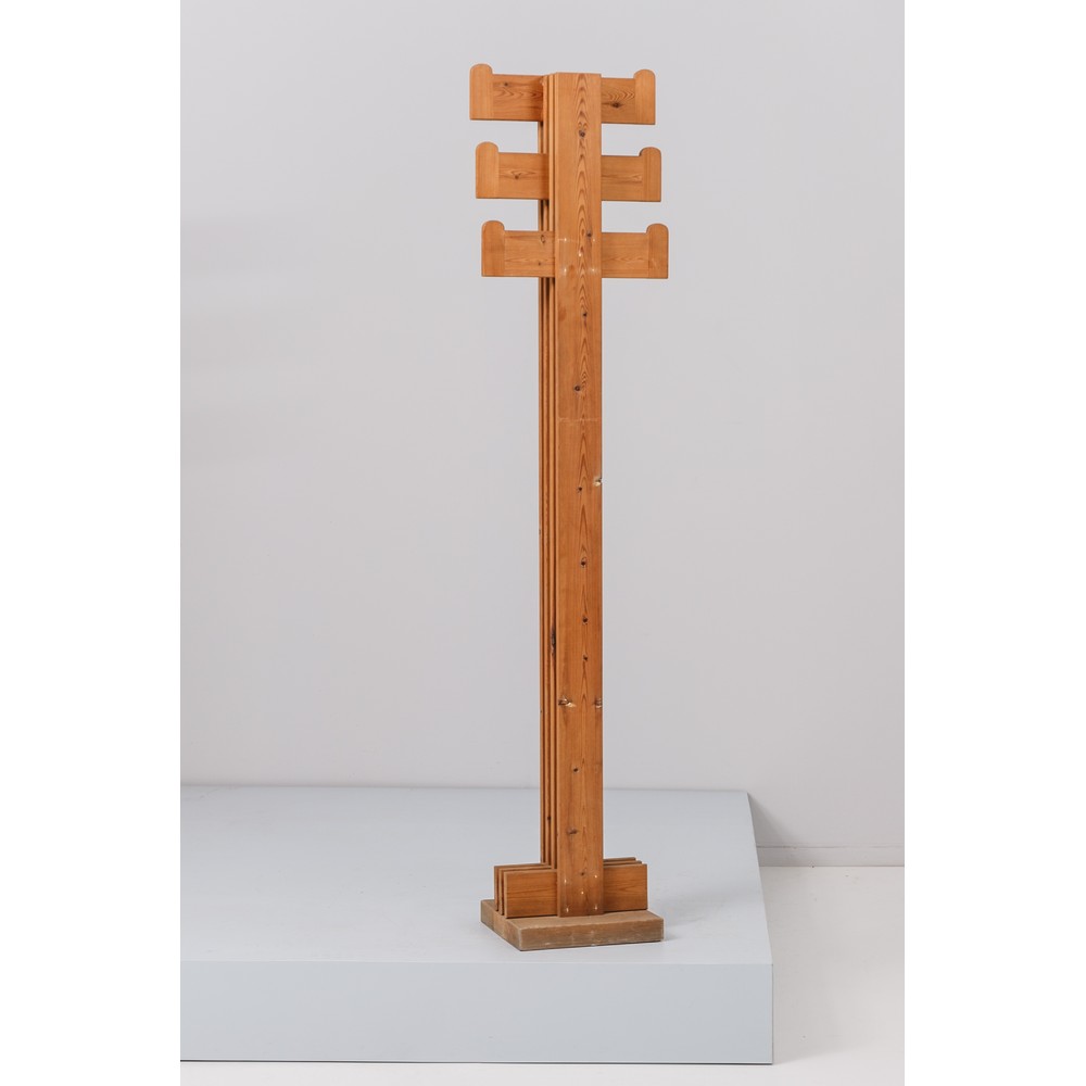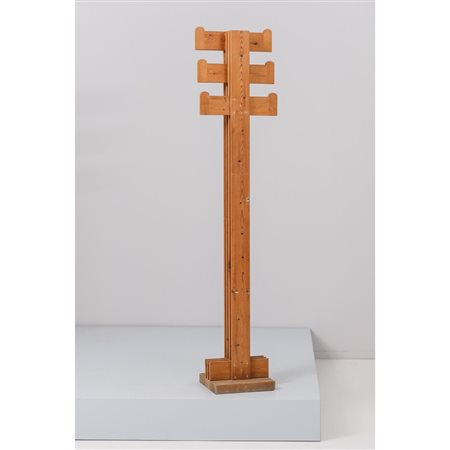 Appendiabiti composto da fasce di legno sovrapposte, base in legno. Segni del tempo.