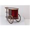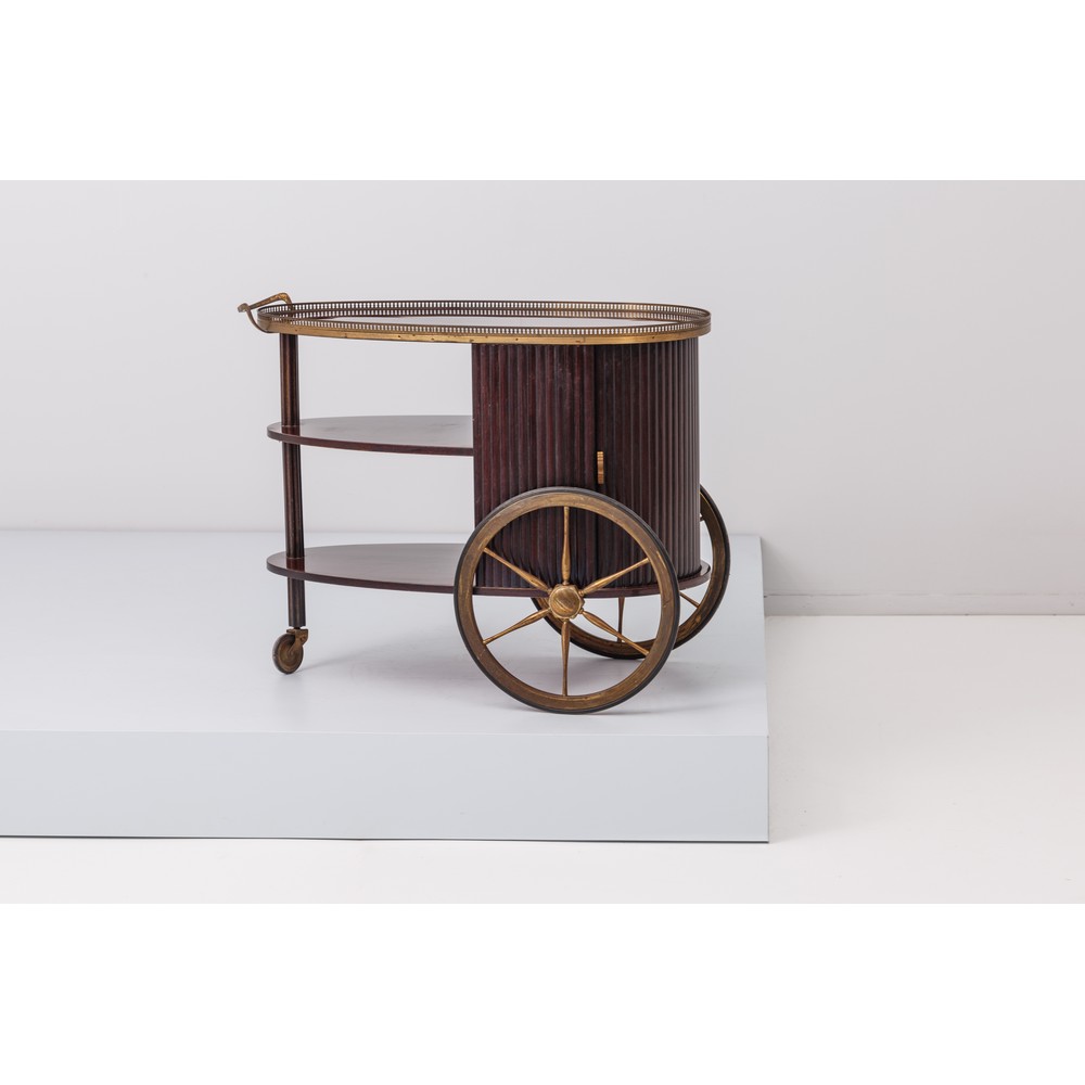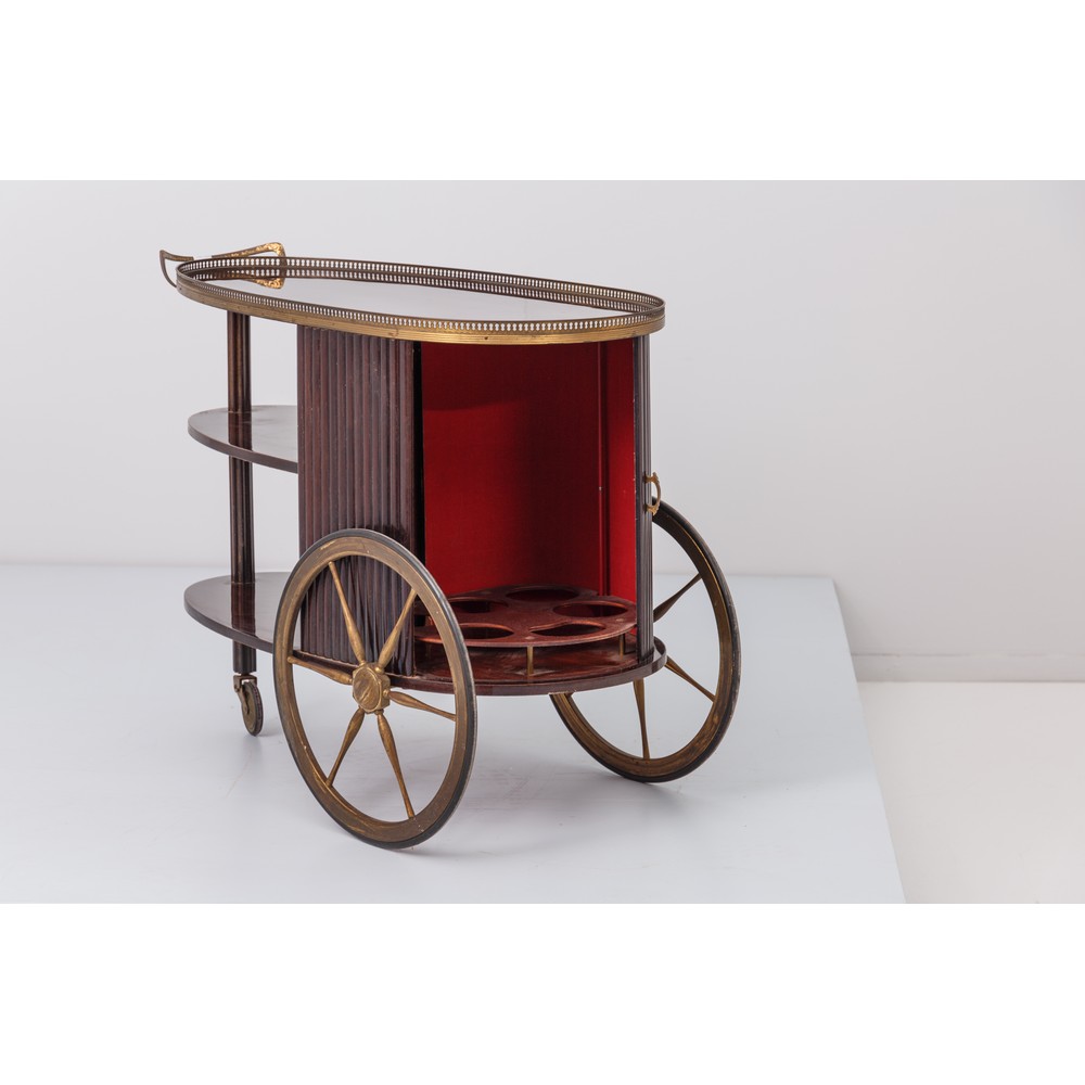 Carrello bar in legno ebanizzato, corpo a ‘biga’ con grandi ruote anteriori, tre ripiani, chiusura a tendina curvata, finiture in ottone.
