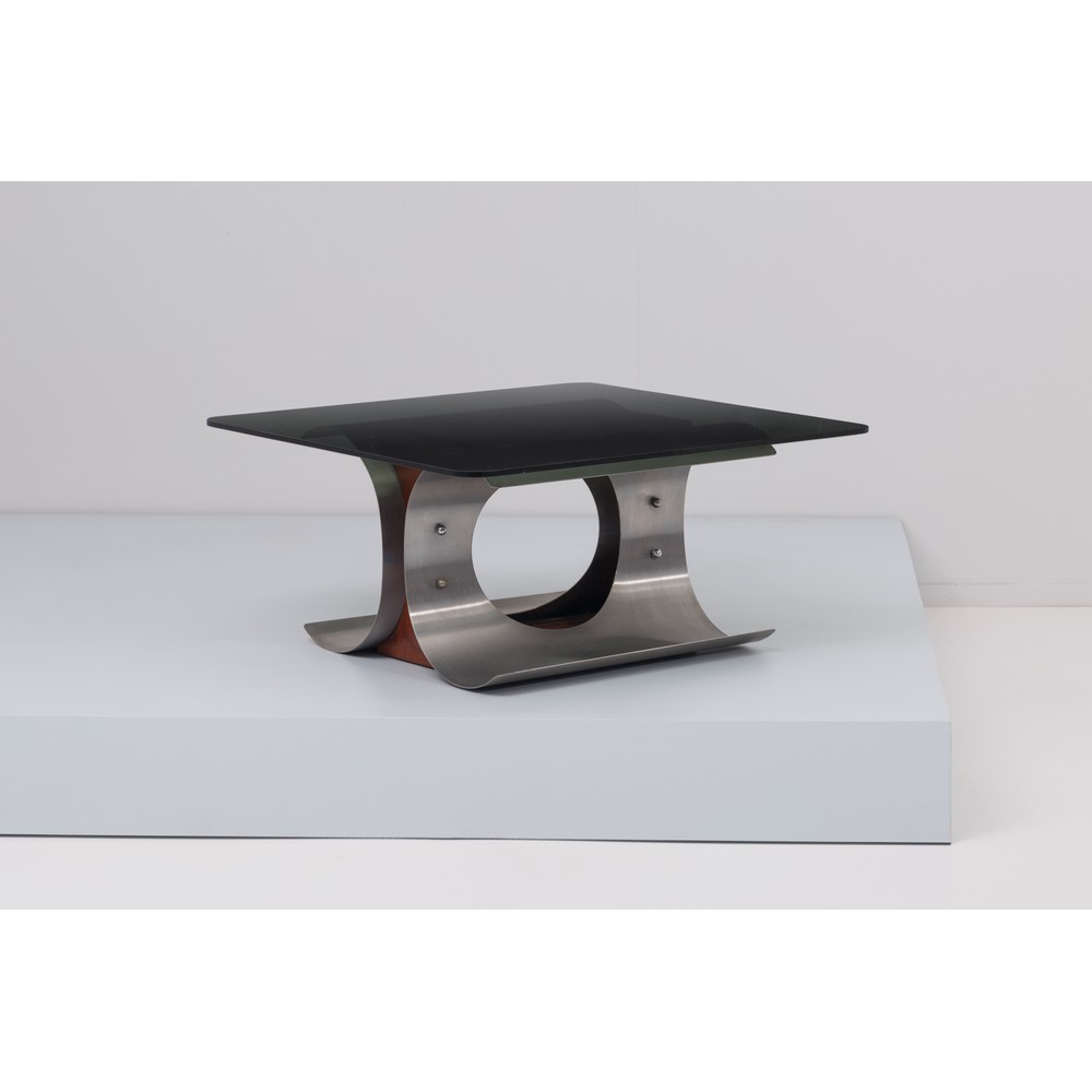Tavolo basso, piano quadrato in vetro fumé, piede in lamina curvata d'acciaio spazzolato. Segni di usura.
