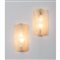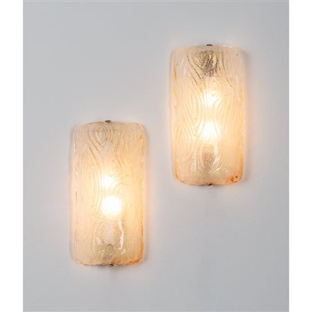 Coppia di lampade da parete a due luci, corpo semicilindrico in vetro di grosso spessore decorato a rilievo con disegni geometrici astratti, supporto in metallo laccato bianco.