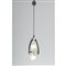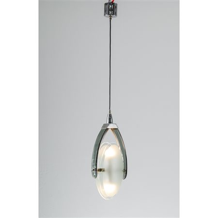 Lampada a sospensione, corpo a goccia in vetro fumé, metallo cromato con due dischi in vetro satinato.