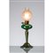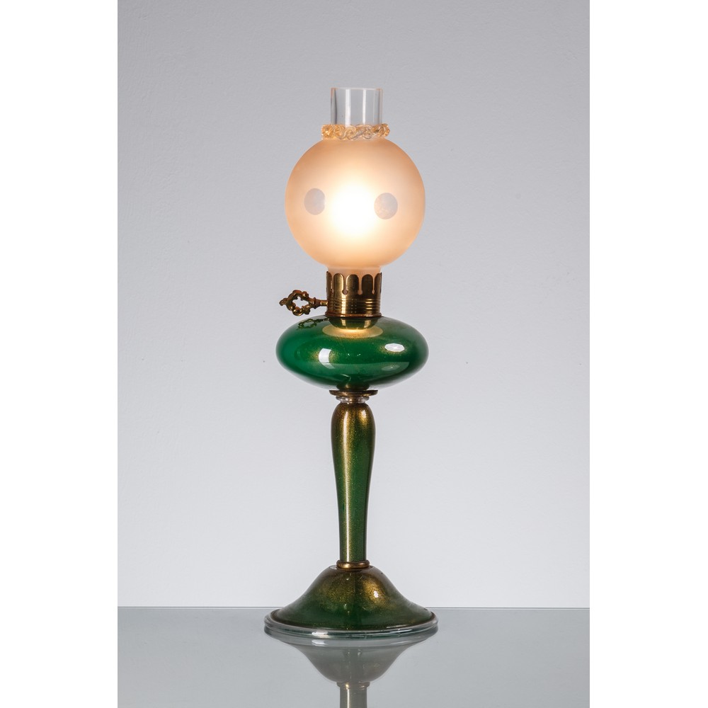 Lampada da tavolo a una luce, corpo in vetro opalino verde con inclusioni oro, elementi di giunzione in ottone dorato, diffusore in vetro satinato bianco con pois trasparenti.
