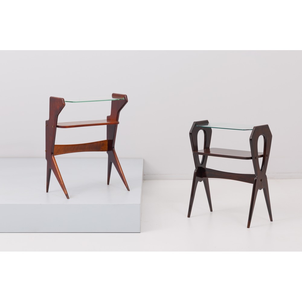 Due Tavoli di diversa forma ed essenza, uno in legno di noce, piano superiore in vetro trasparente con mensola in legno sottostante, piedi a svasare, Uno in legno ebanizzato, piano superiore in vetro trasparente con mensola in legno sottostante, piedi a svasare.