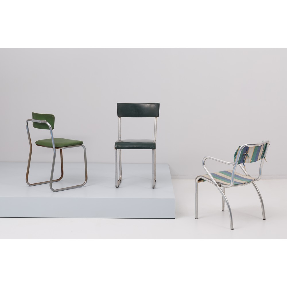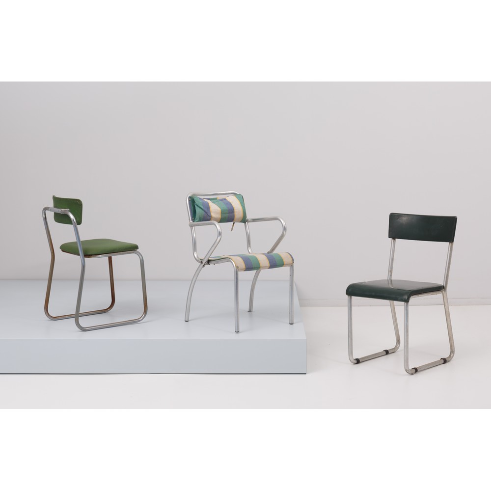 Tre sedie differenti, due con solo seduta e una con braccioli, struttura in tubolari di metallo ed ecopelle verde chiaro, verde scuro e stoffa rigata. Evidenti segni del tempo.