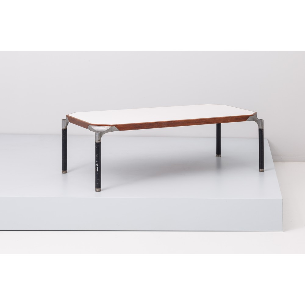 Tavolo basso con piano rettangolare in laminato di legno, piedi in alluminio pressofuso.