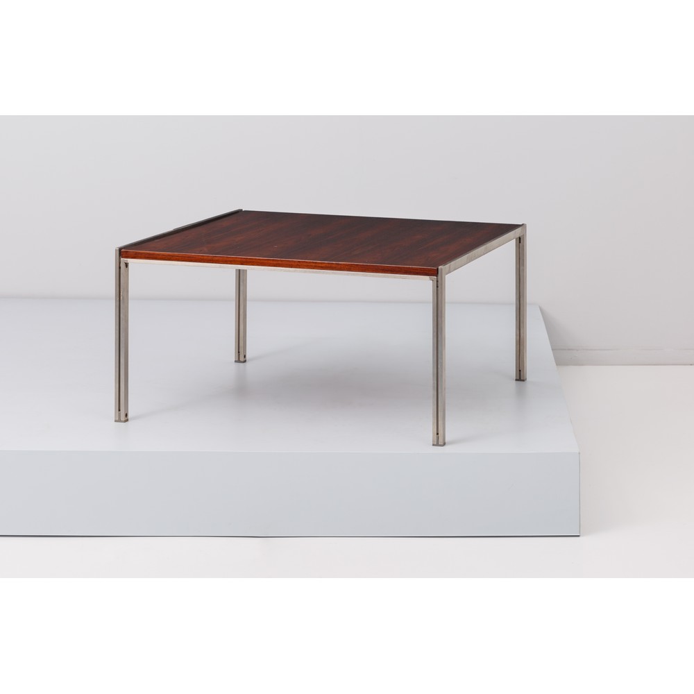 Tavolino basso piano rettangolare in legno di palissandro impiallacciato, gambe in metallo cromato.