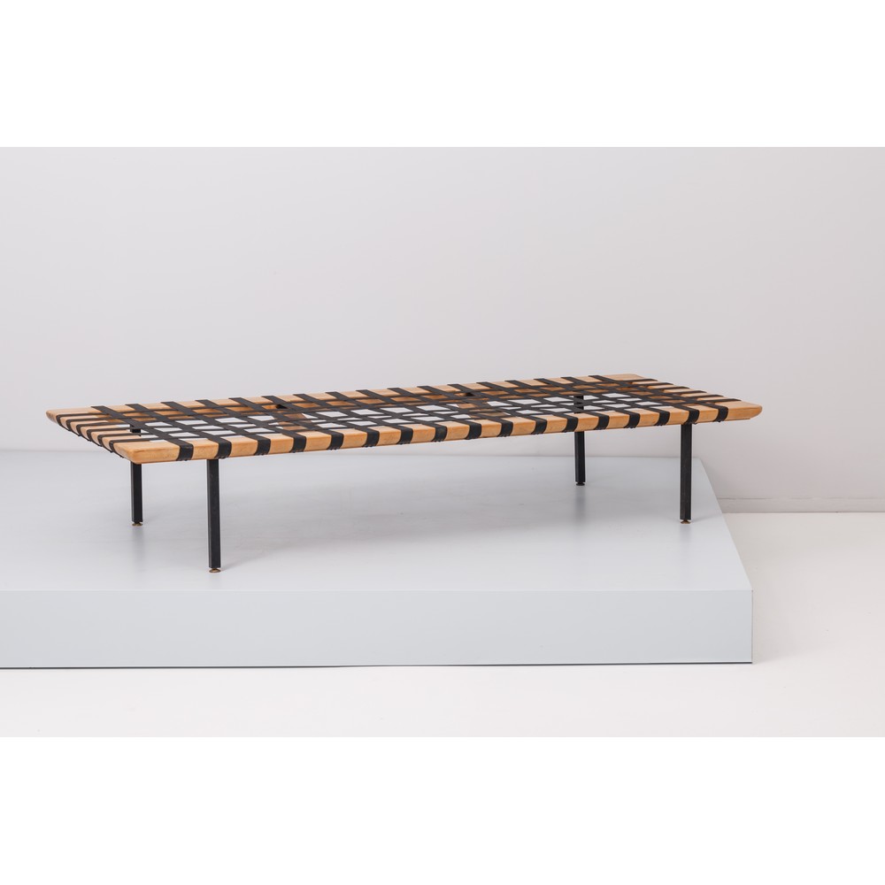 Day bad in frassino con piedi in metallo verniciato nero, fasce di tessuto nero intrecciate.