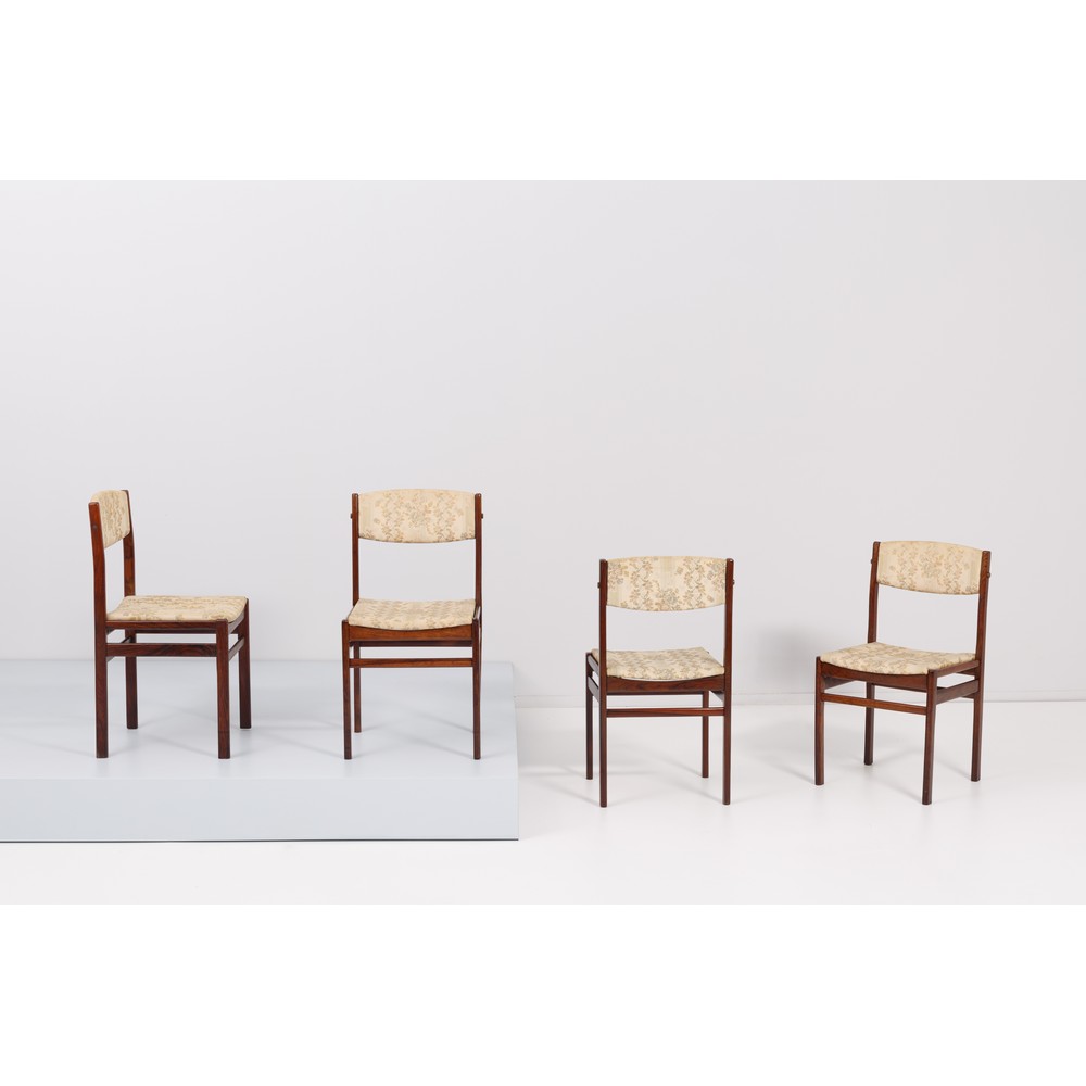 Quattro sedie in legno di palissandro, spalliera e seduta rivestite in tessuto avorio.