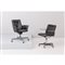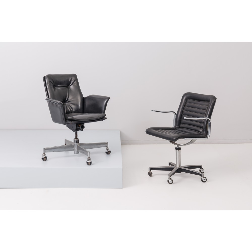Due poltrone da ufficio rivestite in pelle nera con struttura in metallo su ruote, una con braccioli in acciaio curvato.