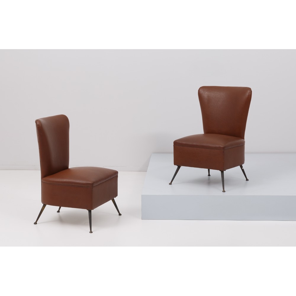Coppia di poltrone basse, struttura in legno con imbottitura, rivestite in skai marrone, piedi a spillo in ottone.