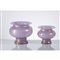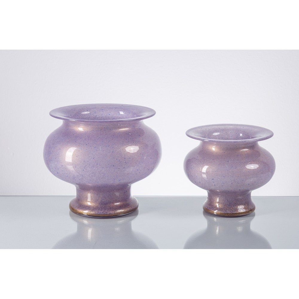 Due vasi in vetro colorato a caldo senza fusione nei toni lilla con sfumature oro, corpo centrale a globo, base cilindrica, bocca piana estroflessa, firma incisa alla base.