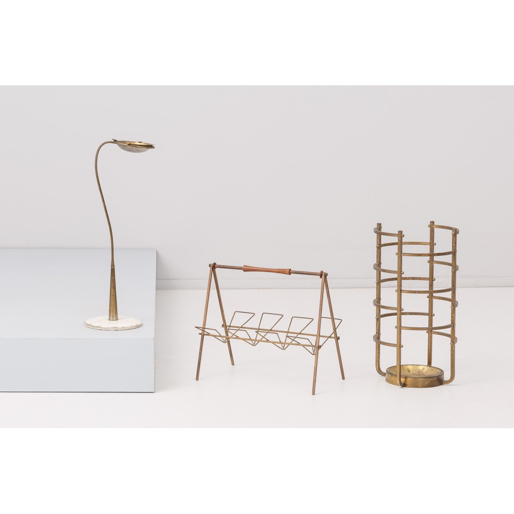 Tre complementi d’arredo, un portaombrelli, un portariviste e un posacenere da terra con base in marmo, ottone.