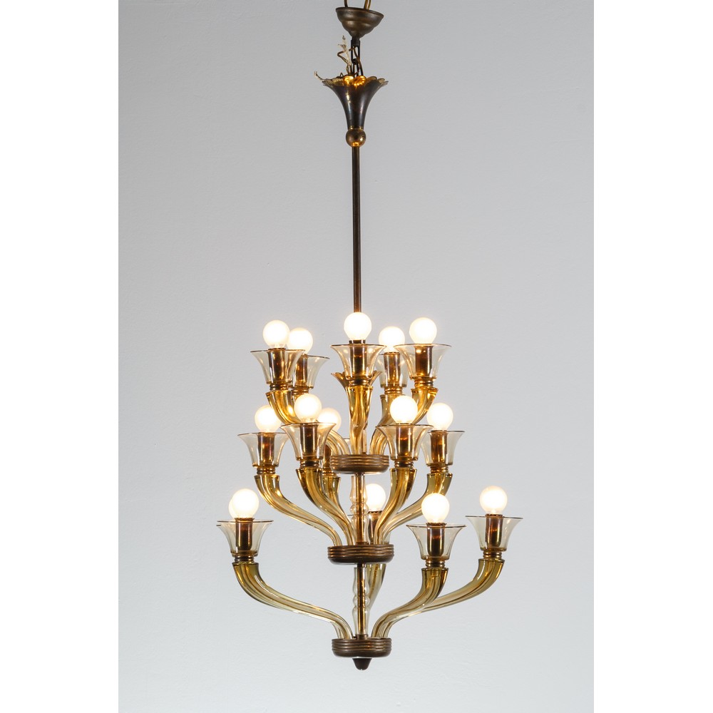Lampada a sospensione a quattordici luci (4+5+5), corpo a tre piani, bracci in vetro trasparente e fumè, diffusori in ottone e vetro, coppe a campana.