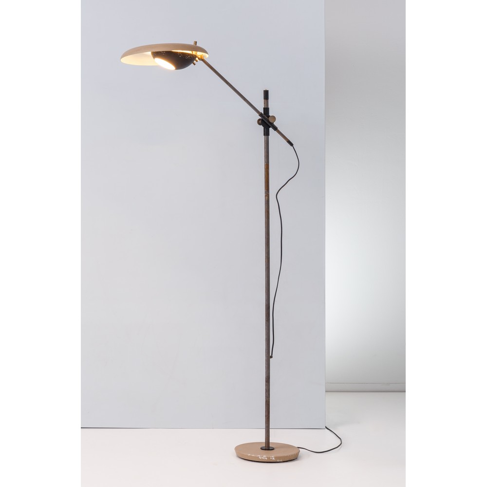 Lampada da terra modello ‘555T’ con braccio orientabile, metallo verniciato, ottone, vetro. Usure e mancanze.