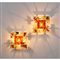 Coppia di lampade da parete ad una luce, corpo quadrato composto da elementi sovrapposti in vetro patchwork nei toni ambra, struttura in metallo.