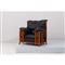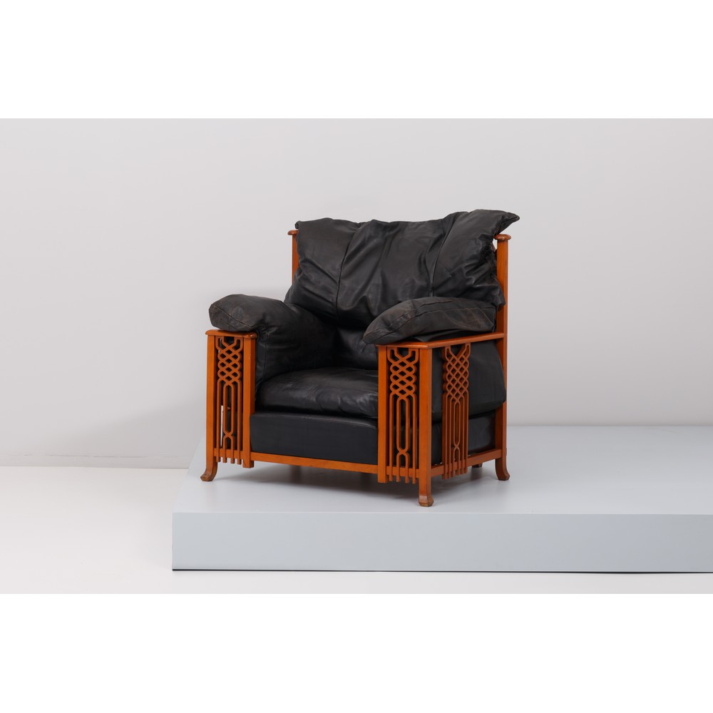 Poltrona in legno, struttura in massello a decoro geometrico, seduta, spalliera e braccioli imbottiti e rivestiti in pelle nera.