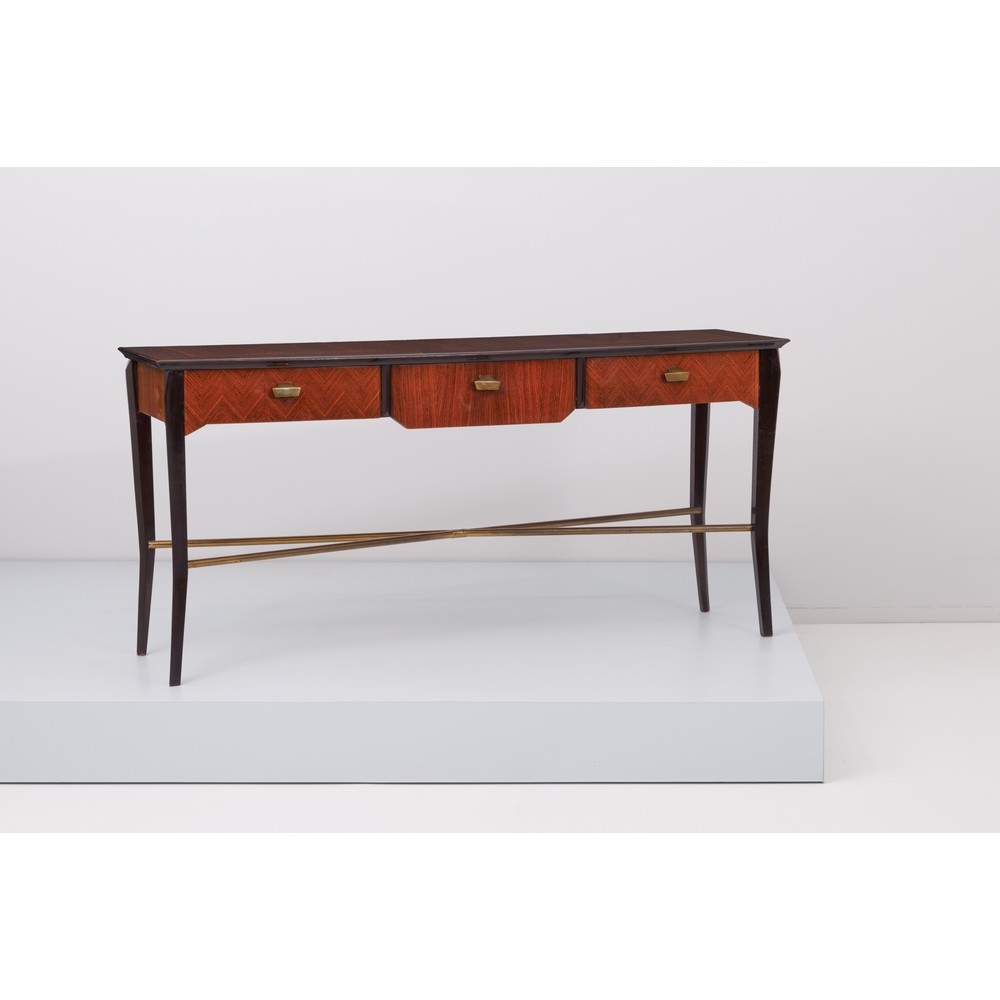 Grande consolle impiallacciata in legno ebanizzato e palissandro, tre cassetti sul fronte, crociera tubolare in ottone, gambe a sciabola, maniglie in ottone.