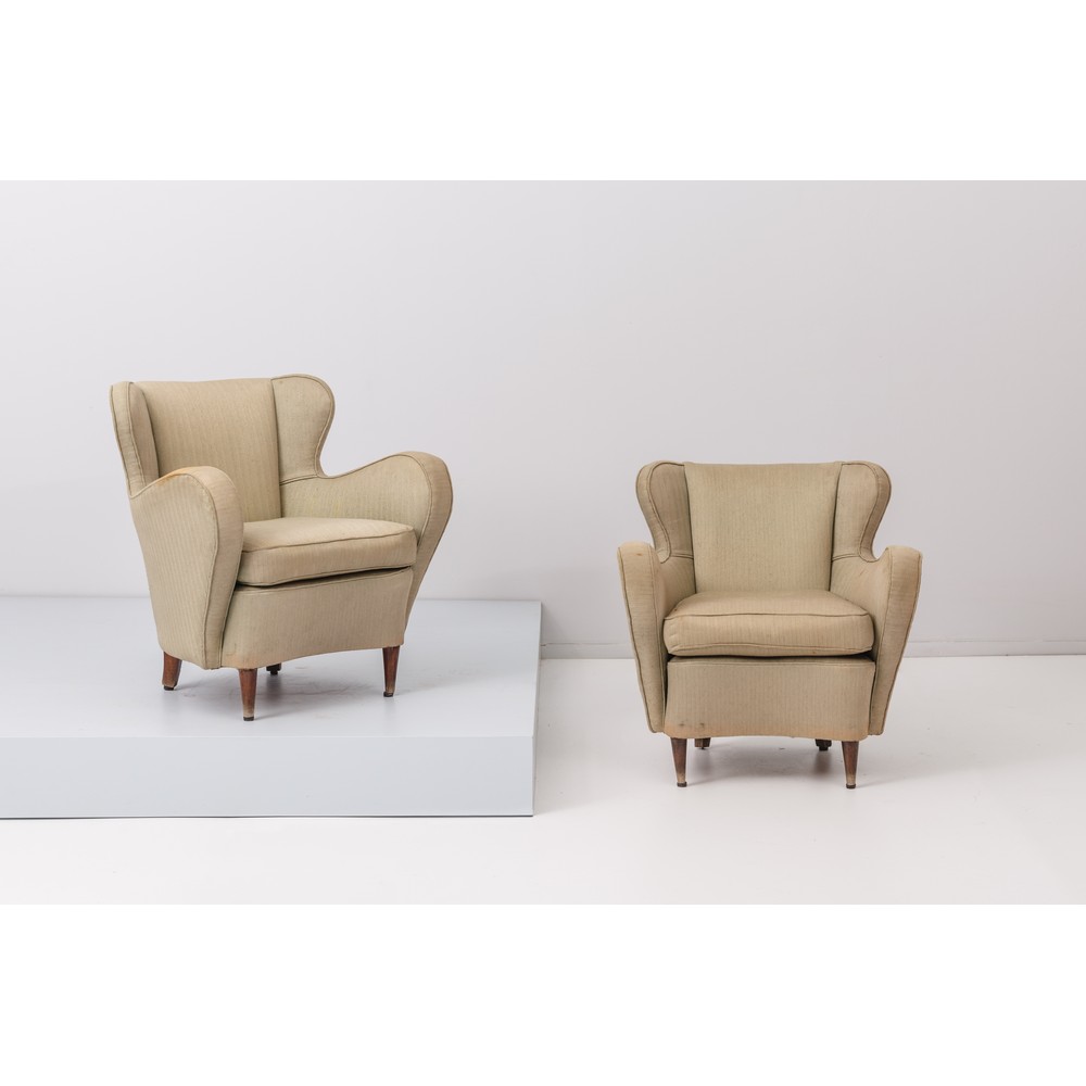 Coppia di poltrone con orecchie, struttura in legno con imbottitura e rivestimento in tessuto beige, piedi conici in legno.