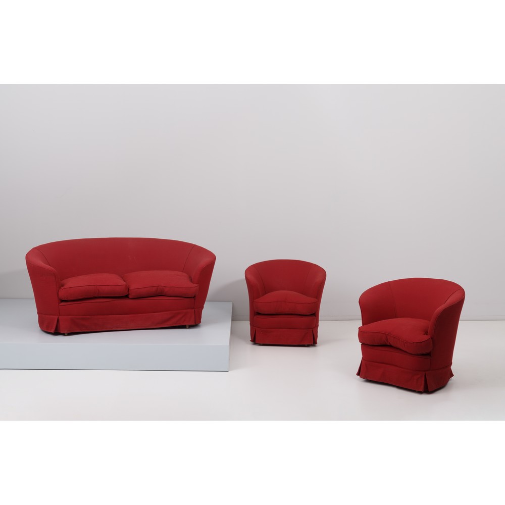 Salotto composto da un divano a fagiolo a due posti e due poltrone, struttura in legno con imbottitura e rivestimento in tessuto rosso scuro.