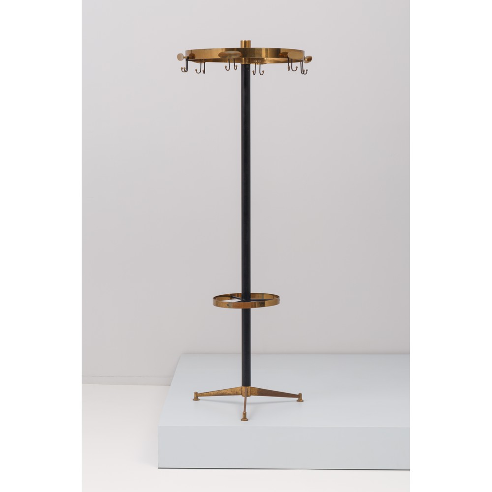 Appendiabiti in metallo verniciato nero, piede, porta ombrelli e appendini in ottone lucido.