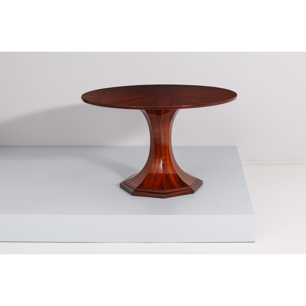 Tavolo rotondo in legno di palissandro, piano impiallacciato, piede centrale a clessidra ottagonale con sfaccettature. Restaurato.