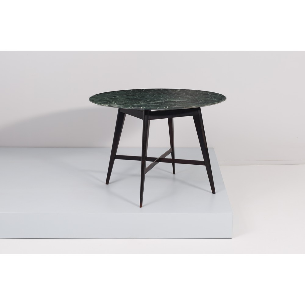 Tavolo da gioco rotondo, piano in marmo, quattro piedi in legno ebanizzato, etichetta di produzione.